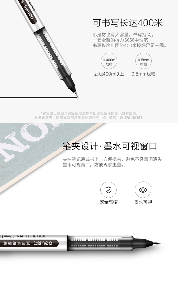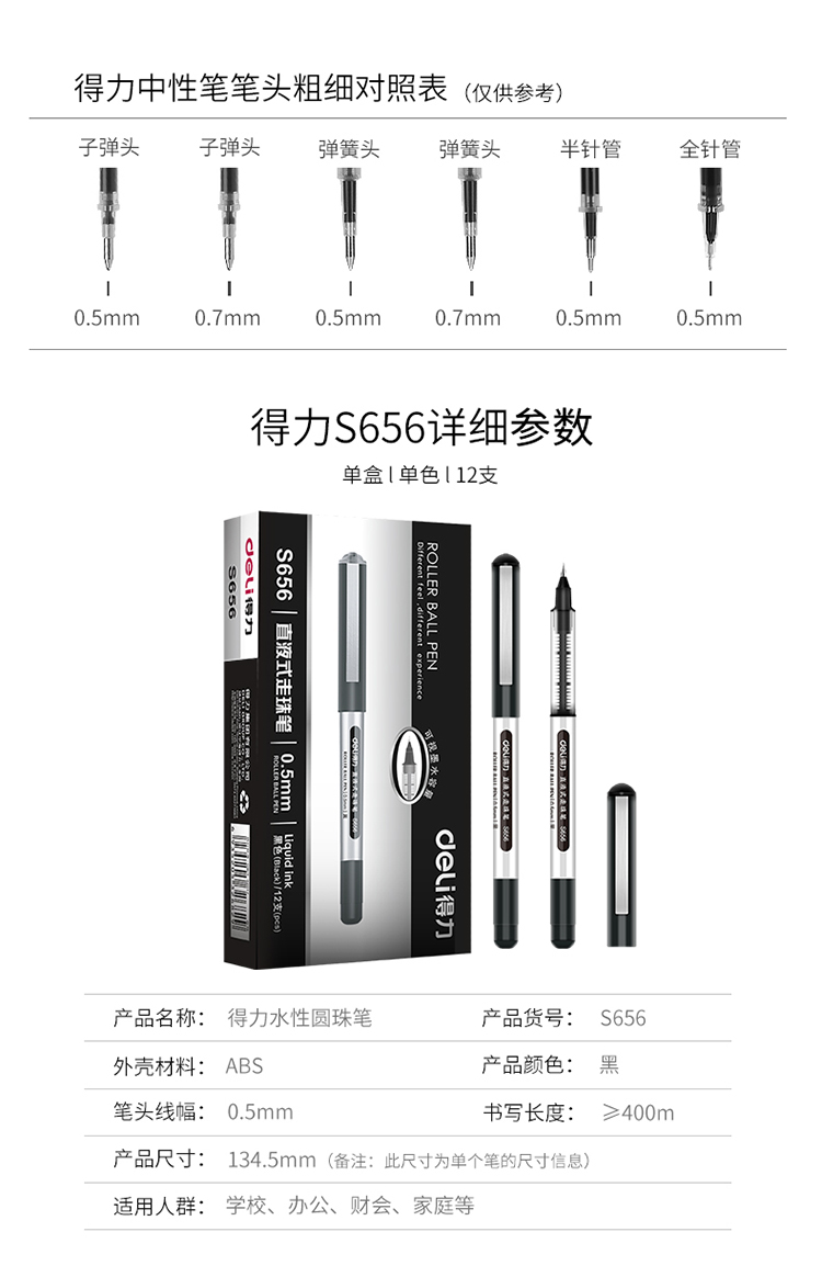 得力(deli)0.5mm黑色直液式走珠签字笔学生考试中性笔 12支/盒S656